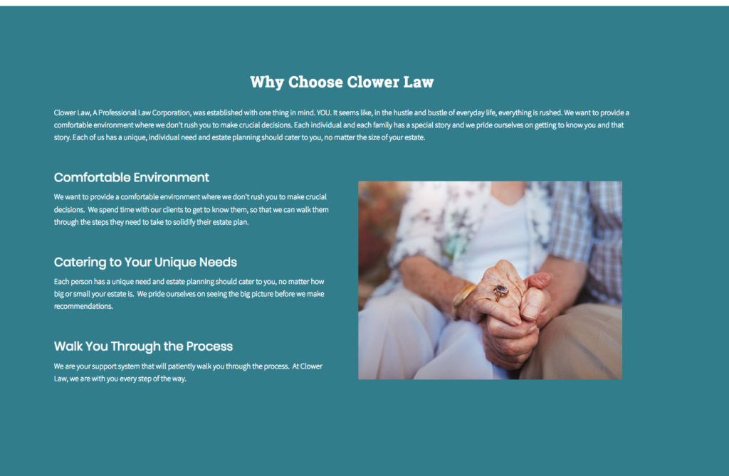 Clower Law is an estate planning firm for all walks of life. Ashley Clower, owner and principle wanted her website to have the same look and feel as her office with a comfortable, friendly non-rushed environment. Click here to visit the website.